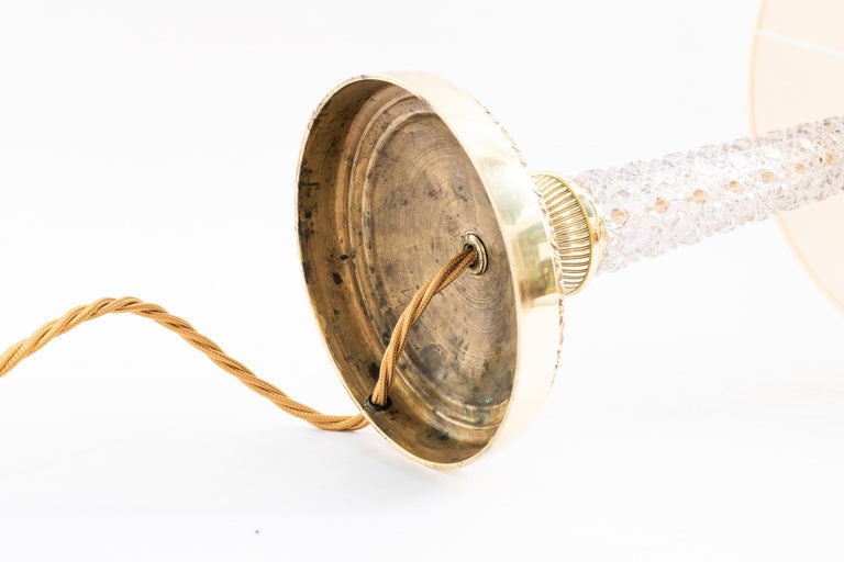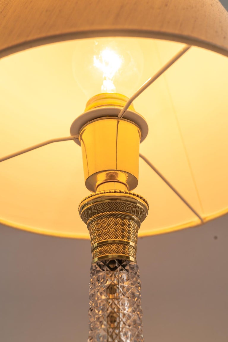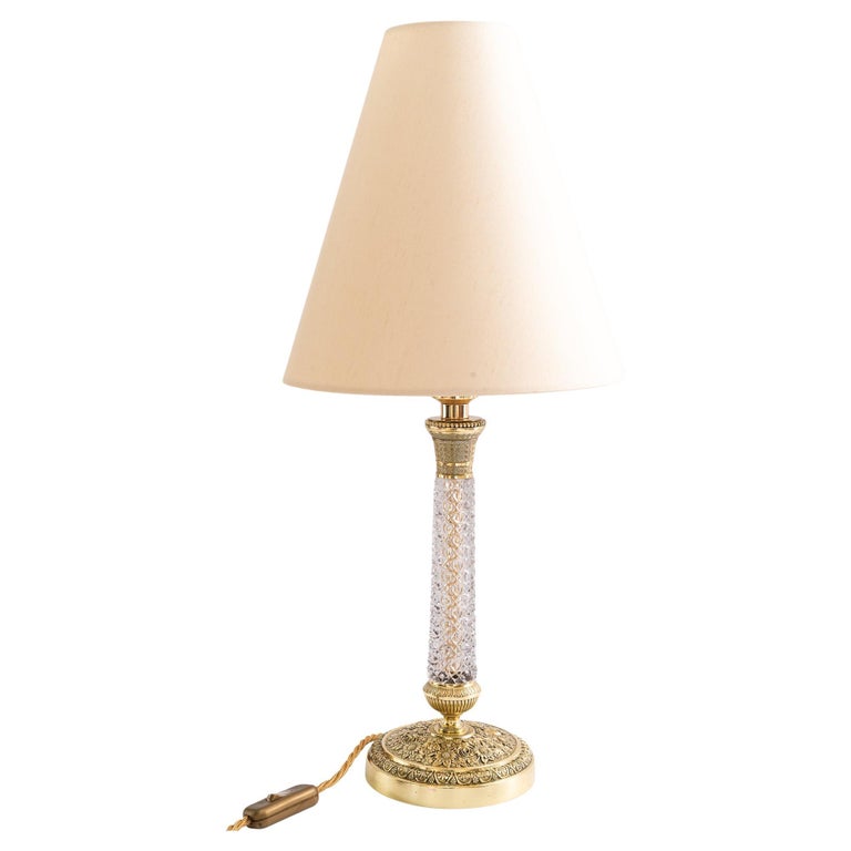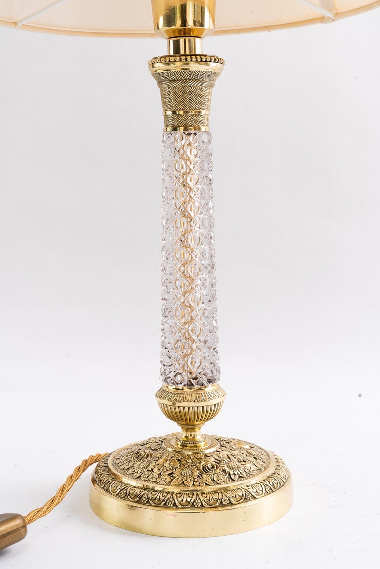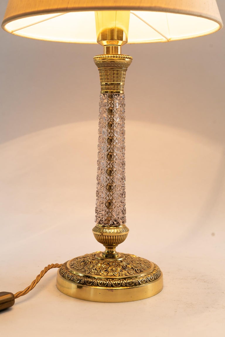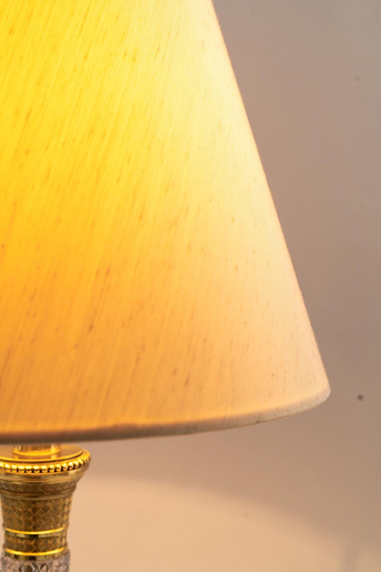 Big historistic cut glass stem table lamp with fabric shade around 1890s